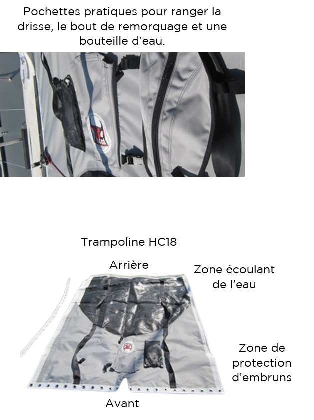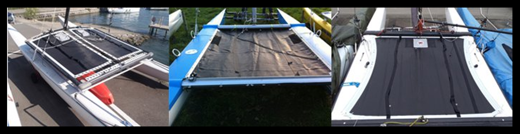 Nous sommes aussi les premiers à proposer un trampoline hybride (pour Hobie Cat 18) avec une partie arrière en Mesh pour laisser écouler l’eau, et l’utilisation d’un tissu étanche sur toute la partie avant du trampoline, pour éviter les projections d’eau et mieux protéger équipiers et barreurs quand ils ne sont pas au trapèze.